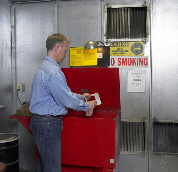 - Potential contamination of personal items. The employee is wearing a shirt with loose long sleeves. A splash of solvent could not only damage the shirt, but the solvent could then be in contact with the worker’s skin.