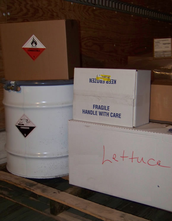 - If you guessed that the hazmat items may not be shipped next to food items, you guessed incorrectly. Section 177.841 only applies to items labeled or placarded as poison or poison inhalation hazard, neither of which includes the corrosive or spontaneously combustible placard on the items in the photo.