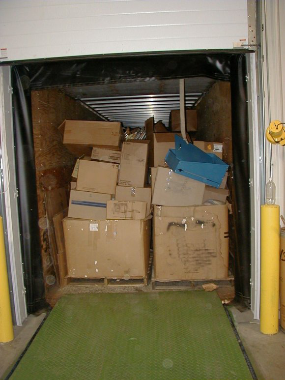 1) Loaded cargo is unsecured from shifting and falling. Heavy cargo (large metal case) is loaded on top of lighter cargo. These conditions pose a safety risk and are likely to cause significant cargo damage.