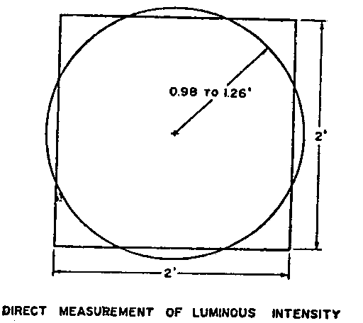 (7) In areas of working places where clearances are restricted to the extent that the photometer cannot be held a sufficient distance from the surface to allow the light sensing element in the instrument to receive reflected light from a field having an area of at least 3 square feet, luminous intensity shall be considered as the average of four uniformly spaced readings taken at the corners and within a square field having an area of approximately 4 square feet. In such instances, the area of each of the individual readings shall not exceed 100 square inches. The average of the four readings shall be not less than 0.06 footlambert. The method of measurement is illustrated by the following figure:
