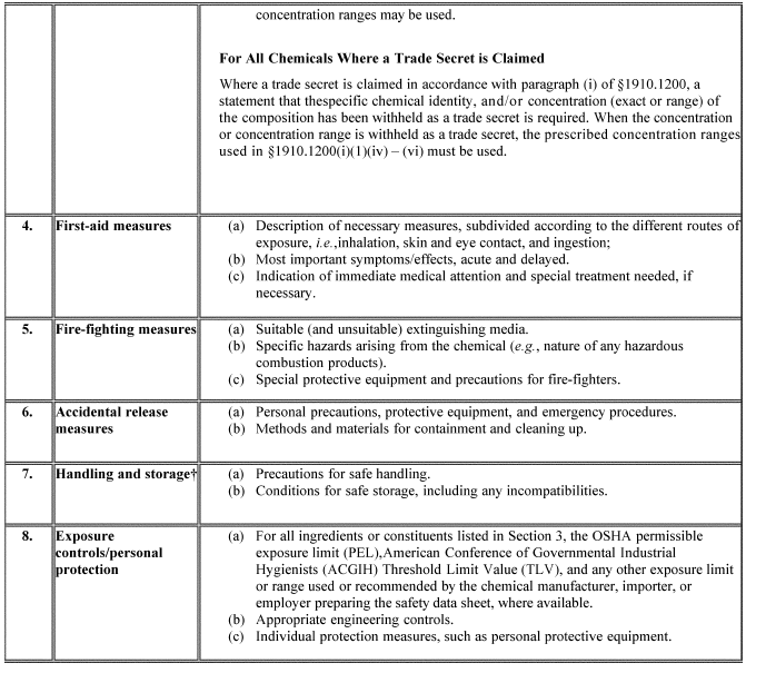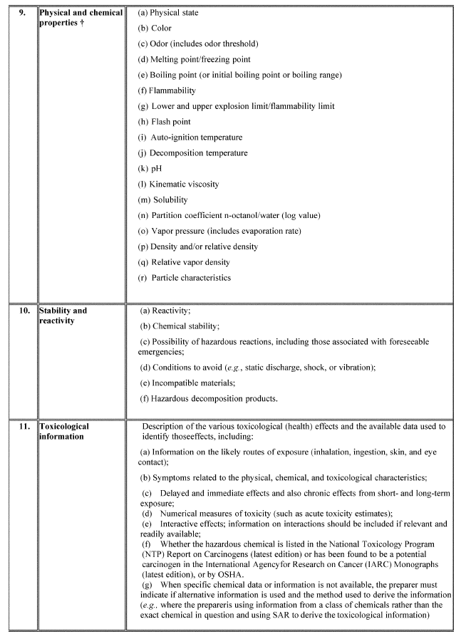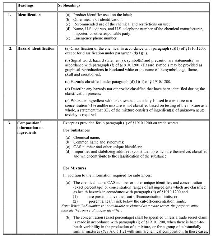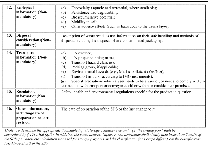 A safety data sheet (SDS) shall include the information specified in Table D.1 under the section number and heading indicated for sections 1-11 and 16. While each section of the SDS must contain all of the specified information, preparers of safety data sheets are not required to present the information in any particular order within each section. If no relevant information is found for any given subheading within a section, the SDS shall clearly indicate that no applicable information is available. Sections 12-15 may be included in the SDS, but are not mandatory.