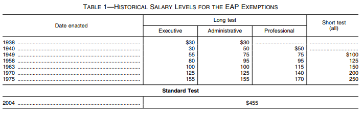 From 1949 until 2004, the part 541 regulations contained two different tests for exemption—a “long” test that paired a more rigorous duties test with a lower salary level, and a “short” test that paired a more flexible duties test with a higher salary level. On April 23, 2004, the Department issued a final rule (2004 final rule), which replaced the “long” and “short” test system for determining exemption status with a single “standard” salary level paired with a “standard” duties test. The Department set the standard salary level at $455 per week.17