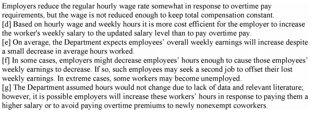 The use of performance rather than design standards. Under the proposed rule, employers may achieve compliance through a variety of means. Employers may elect to continue to claim the EAP exemption for affected employees by adjusting salary levels, hire additional workers or spread overtime hours to other employees, or compensate employees for overtime hours worked. The Department makes available a variety of resources to employers for understanding their obligations and achieving compliance.