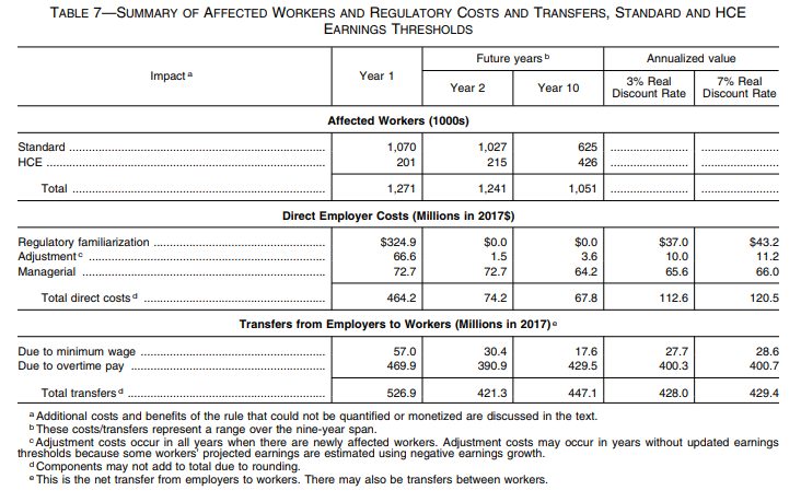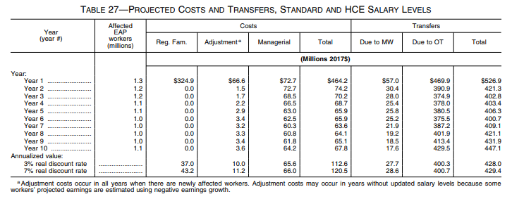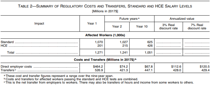 Because the Department is currently enforcing the 2004 salary level, the economic analysis uses the 2004 rule as the baseline for calculating costs and transfers. The economic analysis quantifies three direct costs resulting from the proposal: (1) Regulatory familiarization costs; (2) adjustment costs; and (3) managerial costs. The Department estimates that annualized direct employer costs in the first 10 years following the rule's effective date will be $120.5 million, including $464.2 million in Year 1 and $67.8 million in Year 10. This proposed rulemaking will also give employees higher earnings in the form of transfers of income from employers to employees. Annualized transfers are estimated to be $429.4 million over the first ten years, including $526.9 million in Year 1. Details on the estimated reduced burdens and cost savings of this proposed rule are in the rule's economic analysis.