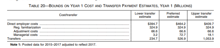 281 When a single affected worker is employed, combined costs and transfers by industry were estimated to range from $151 (in both the publishing (except internet) and hospitals industries) to $1,500 (in transportation equipment manufacturing) per establishment.
