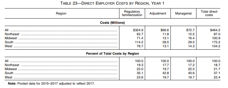 Total first-year private sector costs compose 0.015 percent of private sector payrolls nationwide.290 Total private sector first-year costs compose 0.002 percent of national private sector revenues (revenues in 2017 are projected to be $38.8 trillion).291 The Department concludes that effects of this magnitude are affordable and will not result in significant disruptions to typical firms in any of the major industry categories.