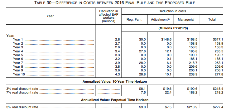 This proposed rule is expected to be an Executive Order 13771 deregulatory action. When the Department uses a perpetual time horizon to allow for cost comparisons under Executive Order 13771, and using the 2016 rule as the baseline, the annualized cost savings of this proposed rule is $224.0 million with 7 percent discounting. The net present value of the cost savings is $3.2 billion using a perpetual time horizon and a 7 percent discount rate.