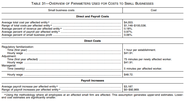 However, comparing costs and payroll increases to payrolls overstates the effects on establishments because payroll represents only a fraction of the financial resources available to an establishment. The Department approximated revenue per small affected establishment by calculating the ratio of small business revenues to payroll by industry from the 2012 SUSB data then multiplying that ratio by average small entity payroll.282 Using this approximation of annual revenues as a benchmark, only one sector has costs and payroll increases amounting to more than one percent of revenues, food services and drinking places (1.5 percent).