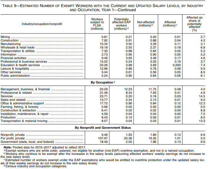 On November 22, 2016, the United States District Court for the Eastern District of Texas issued a preliminary injunction, enjoining the Department from implementing and enforcing the 2016 final rule, pending further review.19 On August 31, 2017, the district court granted summary judgment against the Department of Labor.20 The court held that the 2016 final rule's salary level exceeded the Department's authority and that the entire final rule was therefore invalid. The court determined that a salary level that excludes from exemption an unusually high number of employees who pass the duties test stands in tension with Congress's command to exempt bona fide EAP employees.