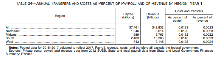 Total first-year state and local government costs compose less than 0.01 percent of state and local government payrolls.292 First-year state and local government costs compose 0.002 percent of state and local government revenues (projected 2017 revenues were estimated to be $3.7 trillion).293 Effects of this magnitude will not result in significant disruptions to typical state and local governments. The $59.2 million in state and local government costs constitutes an average of approximately $657 for each of the approximately 90,106 state and local entities. The Department considers effects of this magnitude to be quite small both in absolute terms and in relation to payrolls and revenue.