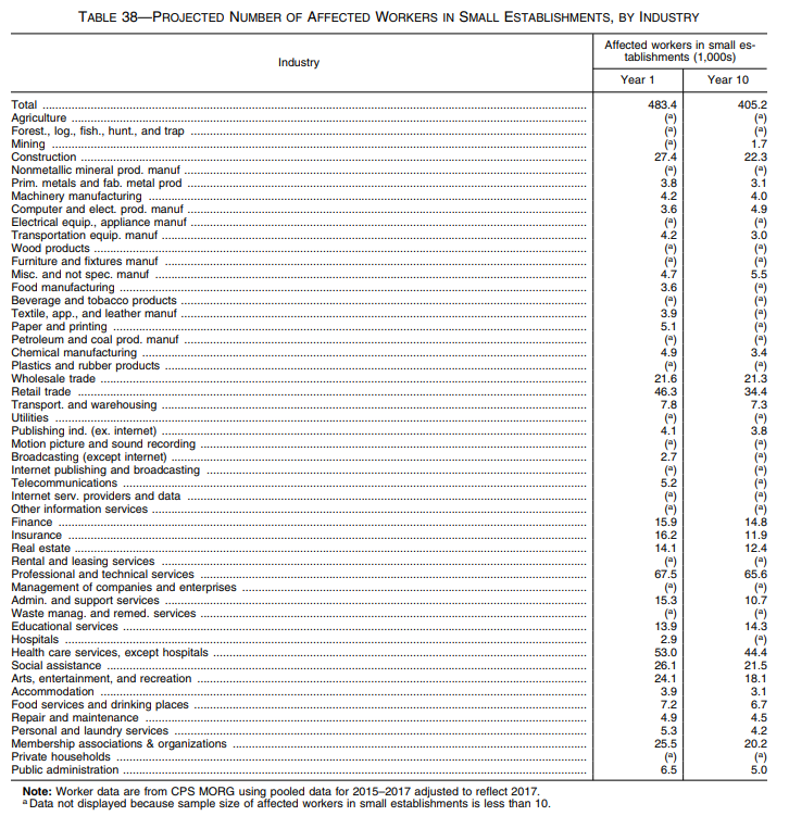 To determine how small businesses will be affected in future years, the Department projected costs to small business for nine years after Year 1 of the rule. Projected employment and earnings were calculated using the same methodology described in Section VI.B.ii. Affected employees in small firms follow a similar pattern to affected workers in all establishments: The number decreases gradually in projected years. There are 483,400 affected workers in small establishments in Year 1 and 405,200 in Year 10. Table 38 reports affected workers in selected years only.