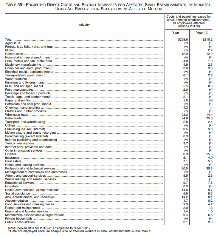 Costs to small establishments vary by year but generally decrease from Year 1 mostly because regulatory familiarization costs are zero in all projected years, and adjustment costs are relatively small. By Year 10, additional costs and payroll to small businesses have decreased from $259.6 million in Year 1 to $210.2 million (Table 39). The Department notes that, due to relatively small sample sizes, the estimates by detailed industry are not precise. This can cause some numbers in the data to vary across years by a greater amount than they will in the future.