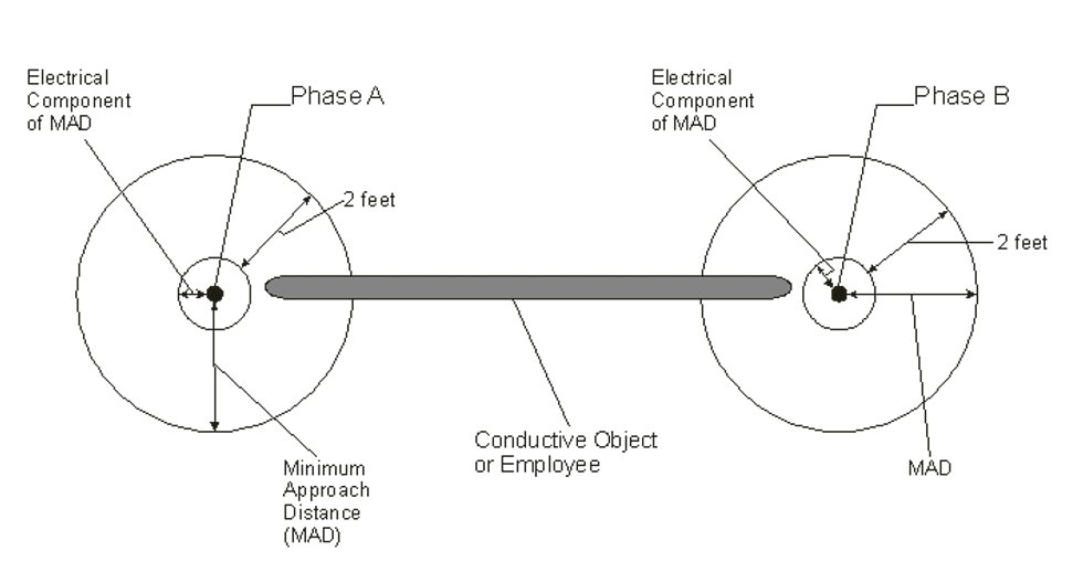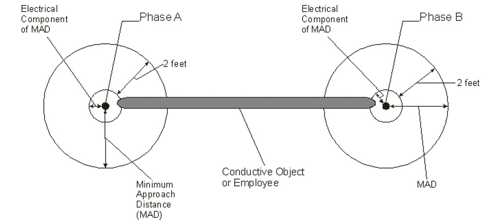 Phase-to-phase exposure exists whenever it is foreseeable that an employee or the longest conductive object he or she may handle can simultaneously breach the electrical components of the MADs of live parts energized at different phase potentials, taking into account such factors as: the nature of the work being performed, the physical configuration and spacing of the conductors, the proximity of grounded objects or other circuit conductors, the method of approach to the conductors, the size of the employee, the tools and equipment being used, and the length of the conductive object. In addition, the employer must always consider mechanical loads and other conditions, such as wind and ice, that could cause a conductor to move or a support to fail. Notably, the determination of whether or not multiphase exposure exists is made without regard to insulation that may be covering the live part or the employee. This is because the exposure determination must be made prior to the selection of insulation in order to ensure that the insulation selected is adequate to protect employees from the electrical hazard. Moreover, it must be noted that phase-to-phase exposure involves not only the hazard of electric shock to the employee, but also arc flash and arc blast hazards from phase-to-phase contact of conductive objects, such as could occur if an employee dropped a conductive object onto or within the electrical components of the MADs of live parts energized at different phase potentials. Diagrams illustrating when phase-to-phase exposure exists can be found at the conclusion of this letter (see Figs. 1 and 2).