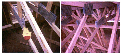 Thank you for bringing your concerns to our attention. In your letter you explain the dangers associated with installing roof trusses made with splicing plates that extend well past the edges of the wood components. You submitted the pictures below depicting how the spikes and sharp edges of these plates pose a hazard to employees: