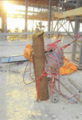 §1926.350(b)(3) Fuel gas cylinders shall be placed with valve end up whenever they are in use. They shall not be placed in a location where they would be subject to open flame, hot metal, or other sources of artificial heat.