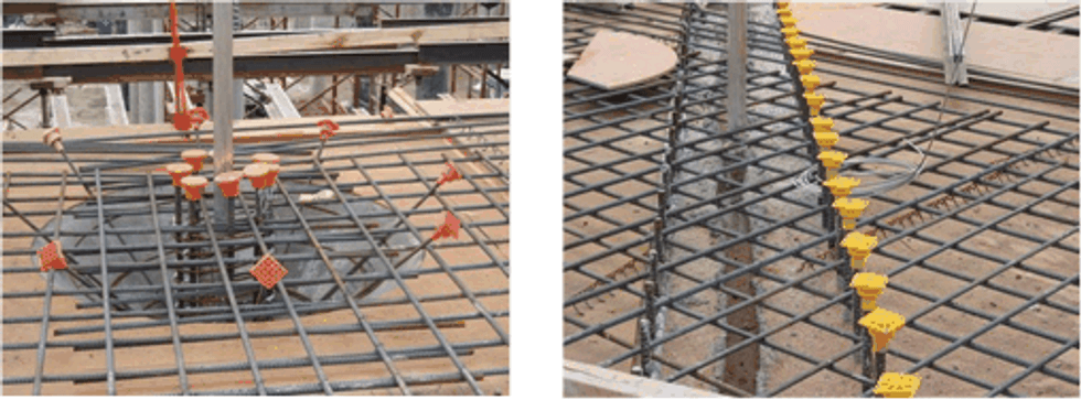 We are also aware that, in situations where the upper rebar mat is prefabricated and hoisted into place as a unit, the rebar protection for the vertical rebar that will intersect with it (and, per design, be tied to it) typically has to be removed before the upper mat can be set into place. The reason for this is that otherwise the caps would catch on the mat and prevent the mat from being properly seated. In that situation the caps/protection for the rebar that will intersect with the mat will have to be removed all at once before the mat is placed. An example of measures that could be used in such a situation would be: